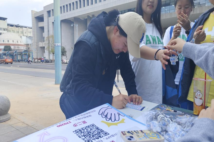 在活动现场,志愿者们向同学们详细介绍了通信大使的职责,不少同学在了解之后扫码关注了“蓝信封邮筒”公众号,并在志愿者们的指引下通过了理论考试,成为预备通信大使。同学们还积极参与了各宣传点位的活动,在签名旗上留下自己的名字,在活动展板上写下近期的烦恼,通过公众号发送“1—100”任一数字获得一张来自乡村儿童的解忧卡。同时为了扩大此次活动的宣传力和影响力,将解忧卡和宣传海报转发至社交平台的参与者均可以获得一份小礼品。