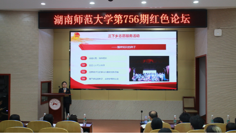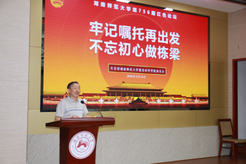 本期红色论坛以学习贯彻习近平总书记今年在湖南考察时的重要讲话精神为主要内容,由四位主讲人结合理论学习与个人实际,畅谈学习心得,引导青年学子牢记嘱托再次出发,不忘初心争做栋梁。邓丹丹结合自身实际,呼吁教科学子为实现教育公平,建设教育强国、人才强国而不懈努力;李家成从“师者”“使者”“学者”三个角度讲述对教育初心的理解;陈嘉鑫结合自身经历,号召大家传承与践行开拓进取的湖湘精神,奋勇争先,书写无悔青春答卷;陈佳静从日常生活中的小故事出发,讲述了个人对“树己”与“树人”的全面思考,倡导大家树立“躬耕教坛、强国有我”的志向和抱负。
