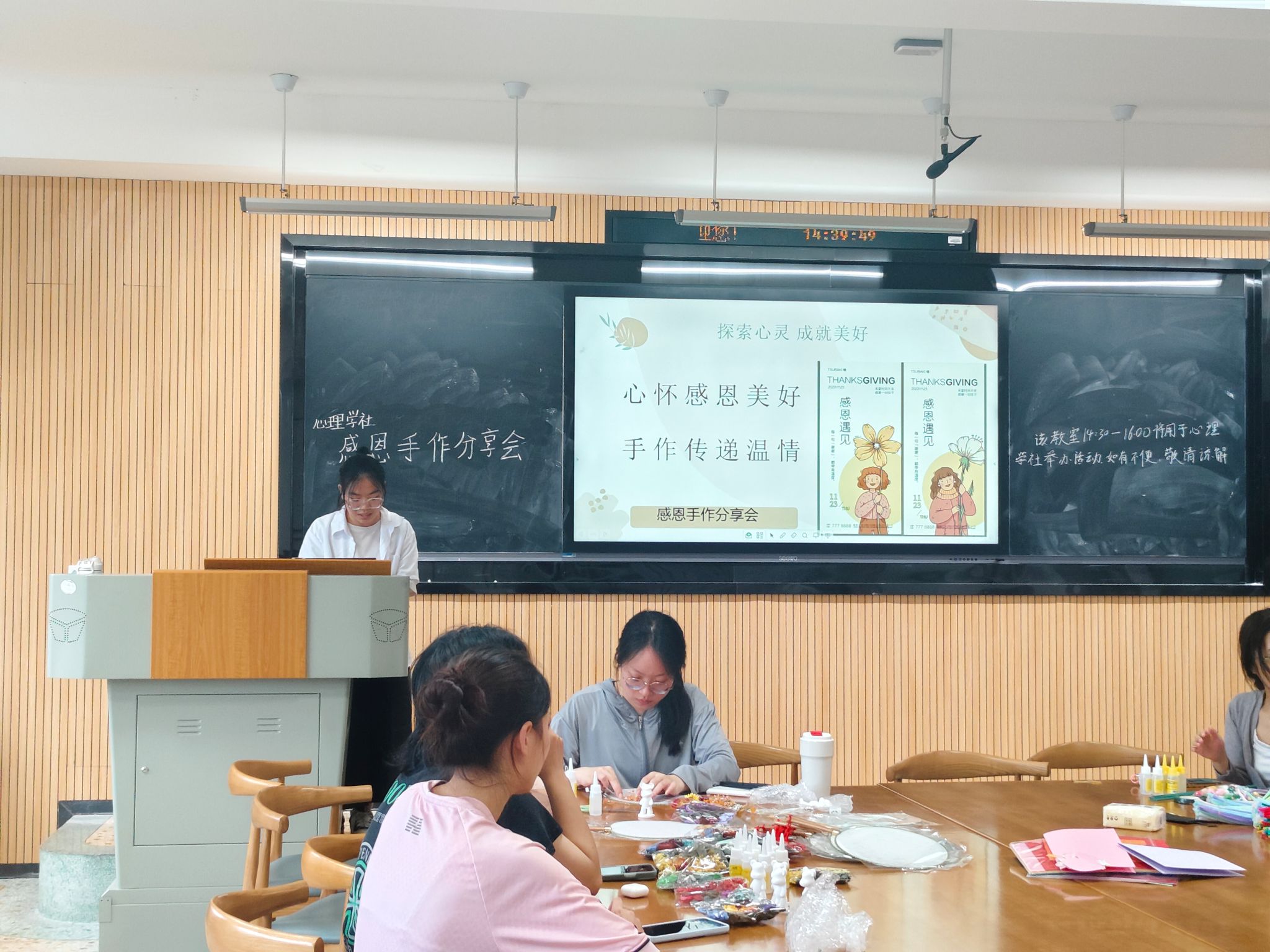 此次活动为同学们提供了一个分享感恩的的平台,引导参与者回忆生活中的感恩点滴,感受来自他人的温暖和支持,不仅有利于加深参与者对感恩的理解,还通过手作作品进一步传递感恩力量,有助于同学们的心理健康发展。