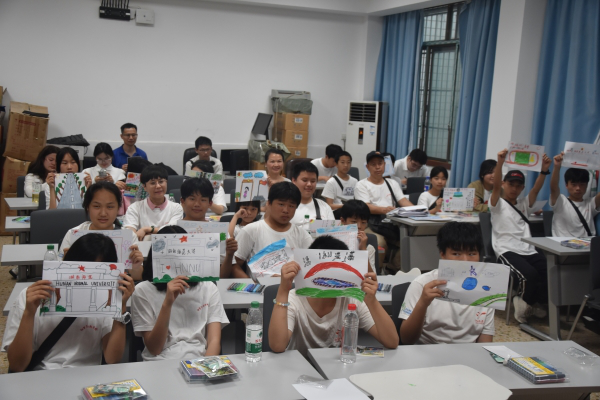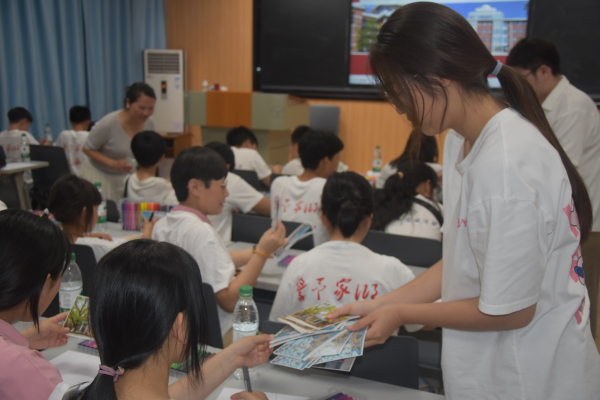 罗帅讲述了教科院志愿者在溆浦县开展暑期三下乡社会实践活动的故事,并向溆浦县的学生们介绍参与此次交流活动的志愿者。就他们对大学生活的疑问与好奇,志愿者周宇璐分享了她眼中的师大和校园生活。她表示,大学生活是充实而精彩的,师大为她提供了更好的发展平台,使其有勇气展示自己、完善自我。随后,周宇璐给学生们分发教科院赠送的水彩笔和师大明信片,并鼓励学生们就活动体验绘制出眼中的师大和心中的大学生活。