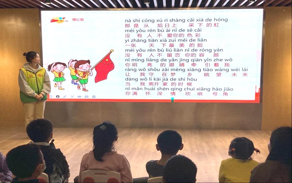 活动开展前,青工部负责人与张且老师进行沟通,确定活动方案。志愿者在此次活动中向孩子们讲解了国旗的由来和设计理念,并通过讲述“江姐绣红旗”的故事和教唱“五星红旗,你是我的骄傲”加深孩子们对爱国精神的理解。