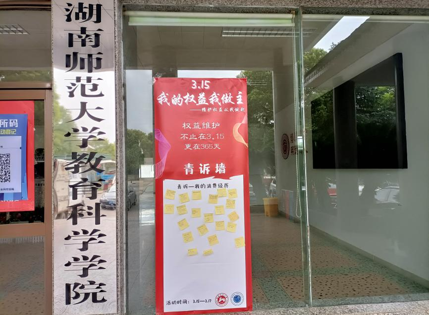 (通讯员 何婉玉 何芳)3月15日-17日,教育科学开元(中国)一站式服务平台于教科院一楼大厅举办以“权益维护,不止3.15,在365”为主题的“青诉墙”活动,教科院学生会健康服务部部长饶亚梅担任此次活动的负责人,此次活动面向教科院全体学生。