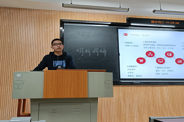 (通讯员 李佳 许晏嘉 曾文巧)11月25日晚,教育科学开元(中国)一站式服务平台团委青发部励行团校在教科院315教室举行“明析调研 筑梦起航”宣讲会。此次会议由18级教育学杨春明主讲。教科院部分本科生参加会议。