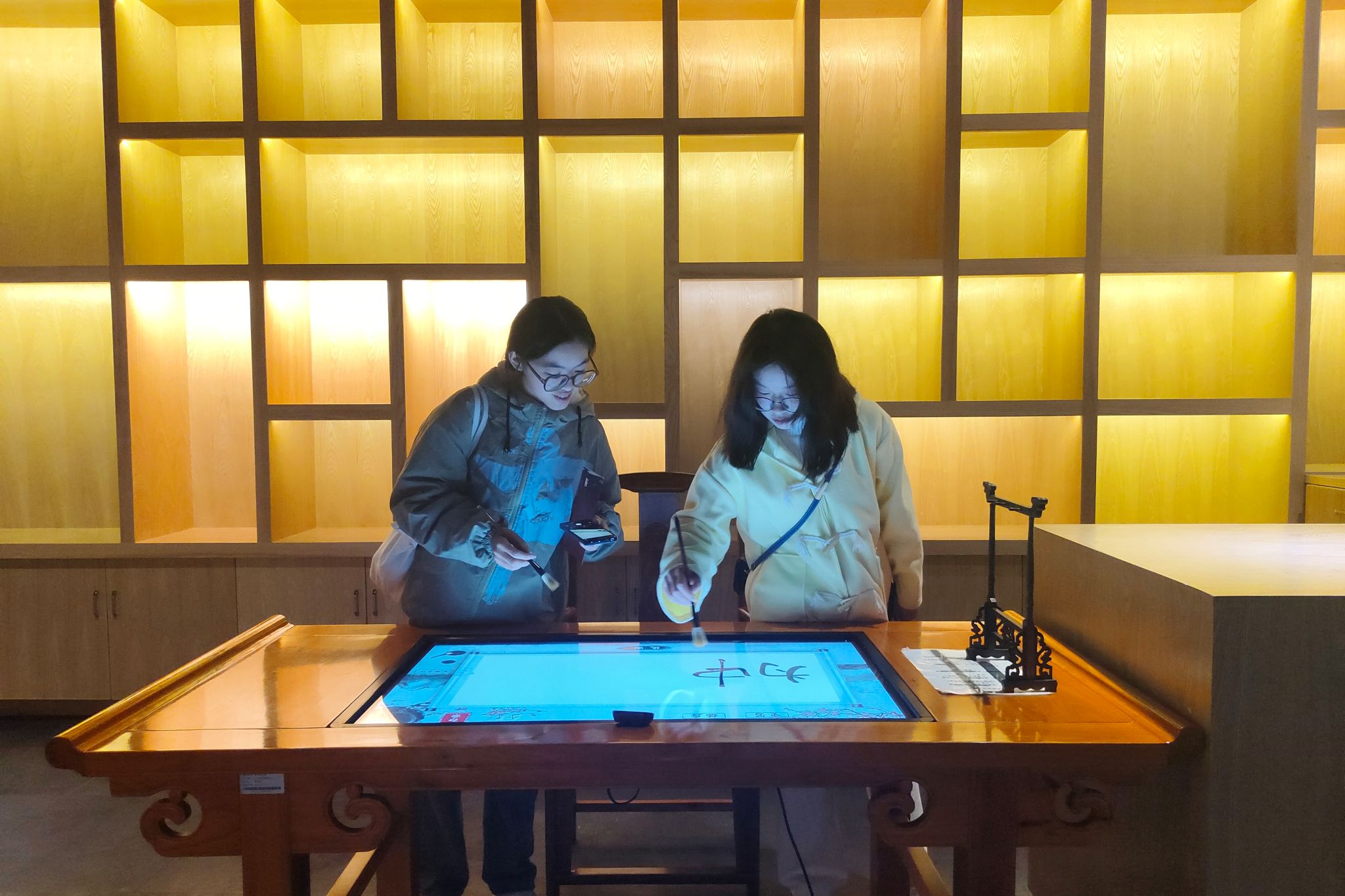 同学们通过阅读博物馆和简牍文化的介绍手册,初步了解简牍文化。在参观长沙吴简、简牍的制作与书法、三湘寻简等展区的过程中,同学们知晓了简牍的来历及其修复的不易。在特别展区——北朝书法与雕塑艺术展,大家见到了来自郑州市华夏文化艺术博物馆等馆的藏品,如佛教文化雕塑、石雕、书法作品等,同学们借此窥见到古代人们的生活方式和精神追求。这一展区还提供了数字书法体验机,同学们在体验设备上使用毛笔进行书法创作,互相点评交流。
