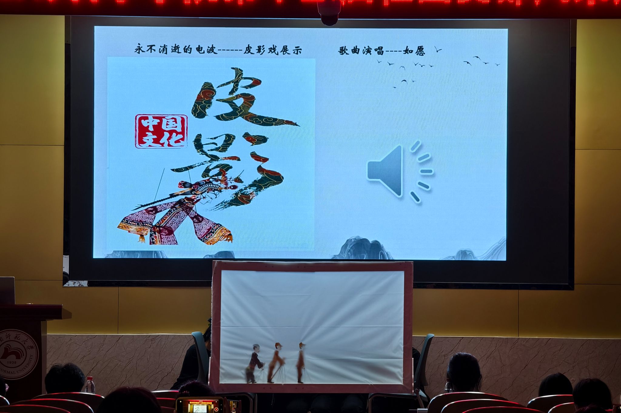 童心巧艺社社团干事刘佩怡担任汇报人,从社团简介、基础设计与特色设计三个方面进行汇报,详细地讲述了社团的发展历史、思想建设、组织建设、宣传建设和形象设计。最后,社团成员为大家带来皮影戏表演——《永不消逝的电波》和歌曲演唱——《如愿》,展现了童心巧艺社“艺教相融、涵养童心”的社团特色。