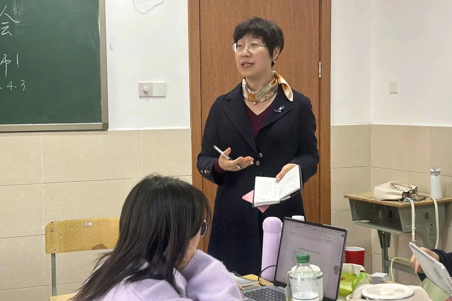史滋福对全队工作进行了系统总结。她充分肯定了队员们的努力,表扬部分队员在课堂管理的有效把控,同时针对不同课堂采取的教学方法提出改进建议。此外,史滋福强调要进一步加强对师范生技能的练习,包括粉笔字、普通话等,并强调队员们要用开放的视角看待评价,调整好心态,继续保持积极与高昂的状态做好未来的实习教学与工作。