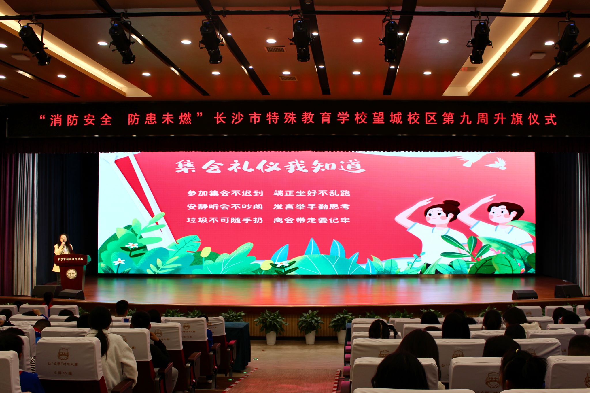 (通讯员 严雨菲 张芸溪 黎思娆)47日上午,长沙市特殊教育学校(望城校区)实习队于缤纷大剧院参加升旗仪式。此次活动分为宣誓、升旗、观看宣传片、表演、竞答、颁奖六个环节。学校全体师生及实习队员共同参与了此次活动。
