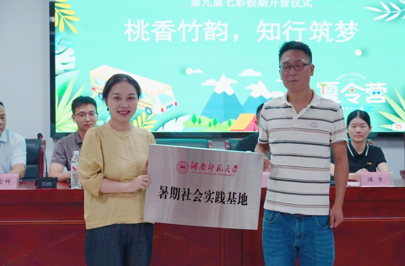 林峻代表湖南师范大学团委向牛田镇完全小学授予“湖南师范大学暑期社会实践基地”牌匾。