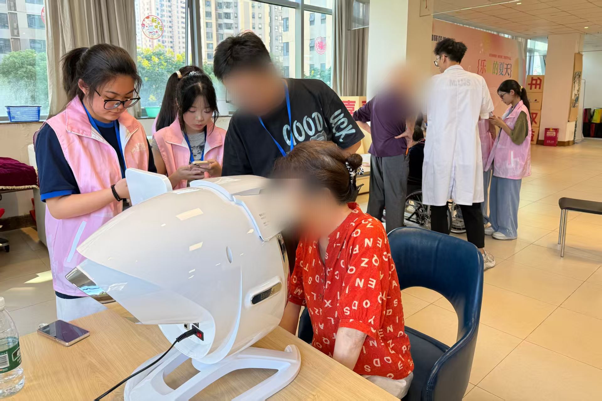 活动开始前,志愿者们协助工作人员布置场地,准备好所需的医疗用具。随后,志愿者们分为引导组、记录组与协助组开展工作。引导组负责协助老人进入三楼活动区域,确保老人们安全就诊。记录组配合医疗团队,在中医诊脉、体检等环节同步记录血压、血糖、心率等基础数据,并录入电子健康档案。协助组则针对智能体检设备的使用,一对一指导老人完成不同的体检环节,确保检测数据的准确。在医疗团队主导的健康筛查环节中,志愿者协助操作现代医疗设备,保障了便捷、无创检查流程的高效推进。活动期间,志愿者时刻维护着现场秩序,确保活动的有序进行。