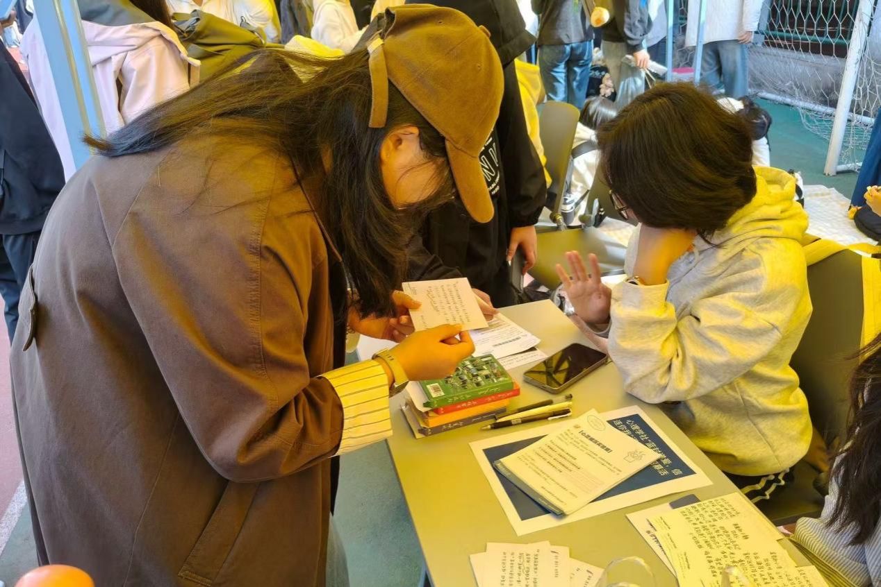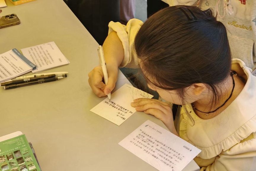 在活动现场,工作人员向同学们介绍了蓝信封项目内容及通信大使的资质要求,不少同学在了解之后扫码关注了“蓝信封邮筒”公众号,并在指引下通过了理论考试,成为预备通信大使。为让同学们直观感受书信陪伴的意义,活动还设置书信体验环节,提供模拟“乡村孩子烦恼”的信件背景卡与明信片。工作人员引导同学们现场撰写回信,并提供写作思路建议,让同学们体验书信陪伴的互动过程。完成体验的同学均领取了蓝信封机构提供的徽章或童声卡片作为纪念。