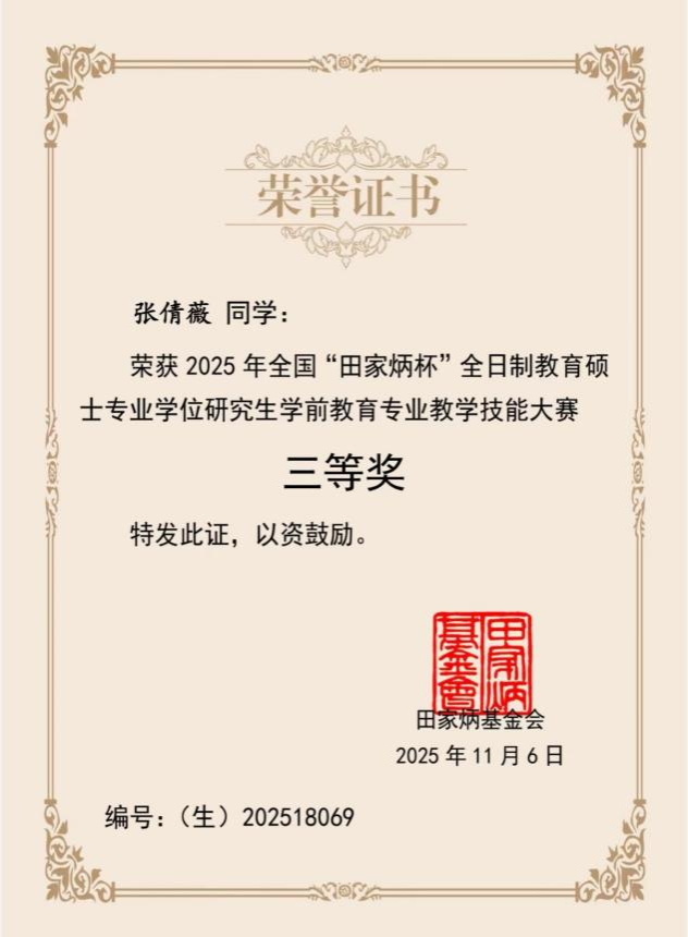 作为全国教育硕士领域的顶尖赛事,2025年“田家炳杯”教学技能大赛各专业赛道分别在南通大学、重庆师范大学、东北师范大学等院校举办。我院学子在多赛道中脱颖而出:由陈杰、周俊凡老师指导的特殊教育(卓越班)曹馨同学、特殊教育专业的蒋成科雯同学分别荣获2025年全国“田家炳杯”全日制教育硕士专业学位研究生(特殊教育专业)教学技能大赛全国一等奖、三等奖;由杨莉君、刘慧霞老师指导的学前教育专业张倩薇、舒薇同学分别获得2025年全国“田家炳杯”全日制教育硕士专业学位研究生(学前教育专业)教学技能大赛全国三等奖、优秀教学设计奖;由蔡荣华、覃兵老师指导的科学与技术教育专业高程一、余佳盈同学分别获得2025年全国“田家炳杯”全日制教育硕士专业学位研究生(科学与技术教育专业)教学技能大赛三等奖;由丁道群、胡义秋老师指导的李伊伦、张云杰同学分别获得2025年全国“田家炳杯”全日制教育硕士专业学位研究生(心理健康教育)教学技能大赛三等奖。指导教师团队全程保驾护航,为学子们的优异表现提供了坚实支持。